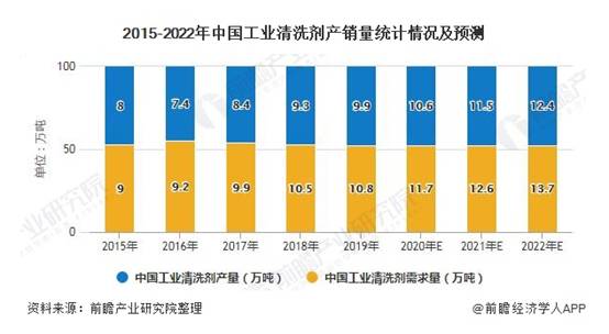 2019年,我國工業(yè)清洗劑產(chǎn)量在9.9萬噸左右,需求量為10.8萬噸,預(yù)計到2022年,我國工業(yè)清洗劑產(chǎn)量將增長至12.4萬噸。2018年我國工業(yè)清洗劑市場規(guī)模為38.0億元,2019年我國工業(yè)清洗劑市場規(guī)模增長至39.4億元。隨著中國制造產(chǎn)業(yè)升級的逐步實(shí)施以及中國本土企業(yè)在中高端制造業(yè)不斷取得突破,中國工業(yè)清洗劑市場還將取得穩(wěn)步發(fā)展。